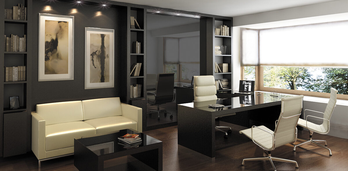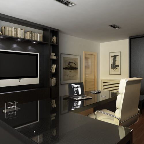 Diseño de despacho para particular, realizado mediante diseño 3D. Se eligieron tonos en roble teñido de negro para el mobiliario principal y tonos crema para la silla y el sofá. El mobiliario es a medida.